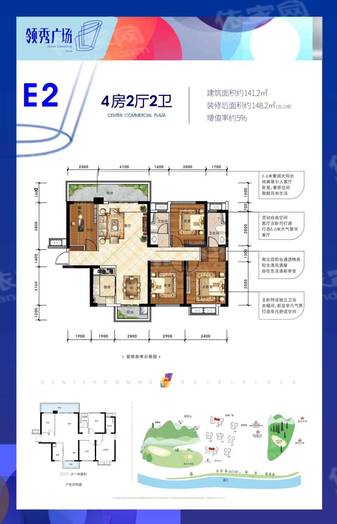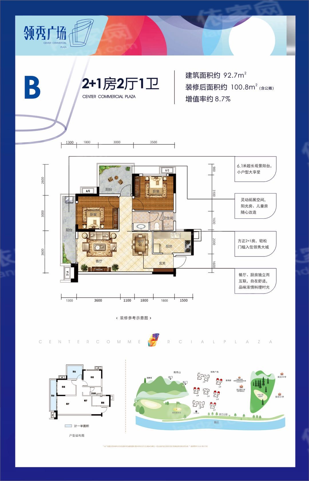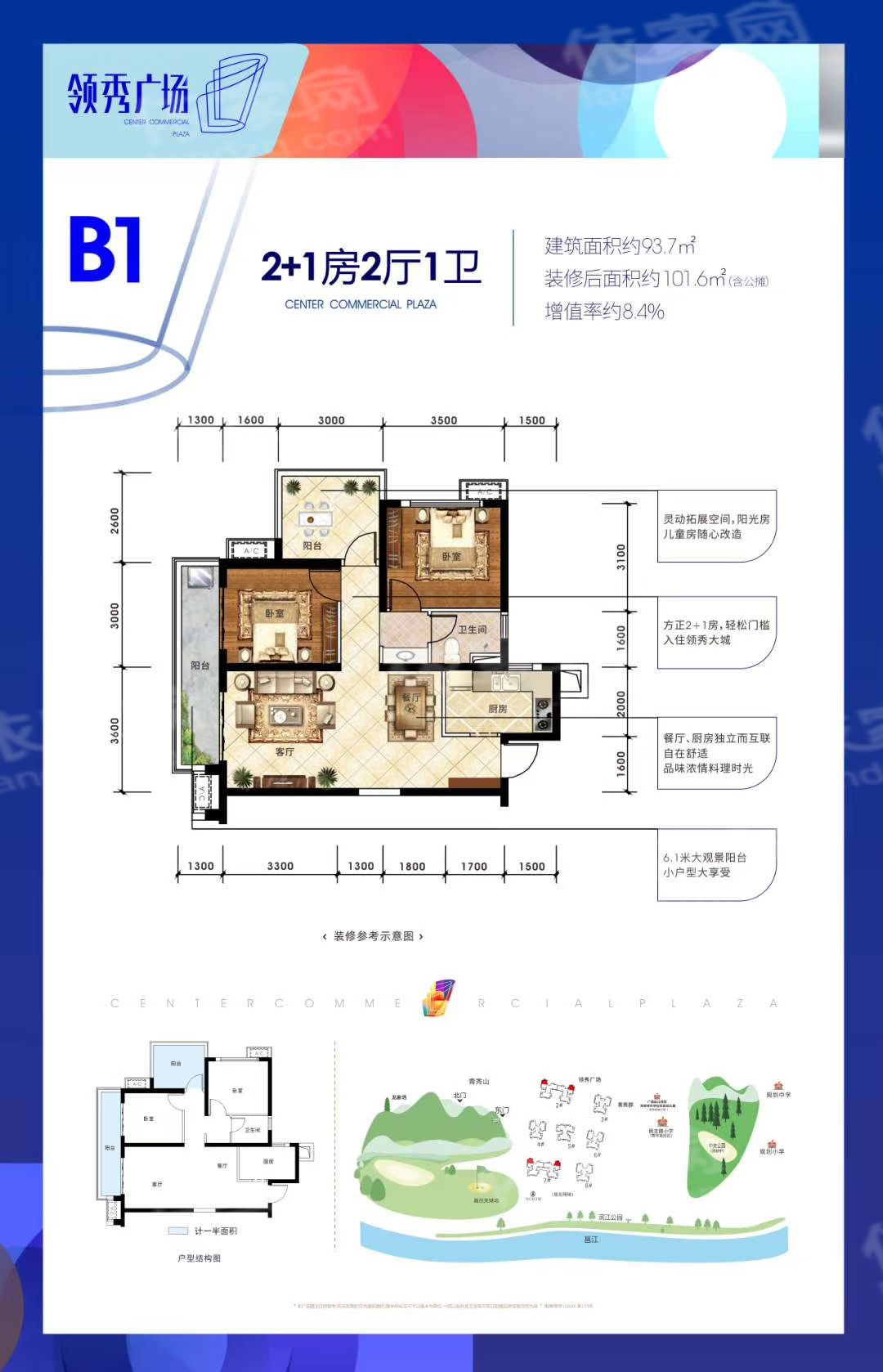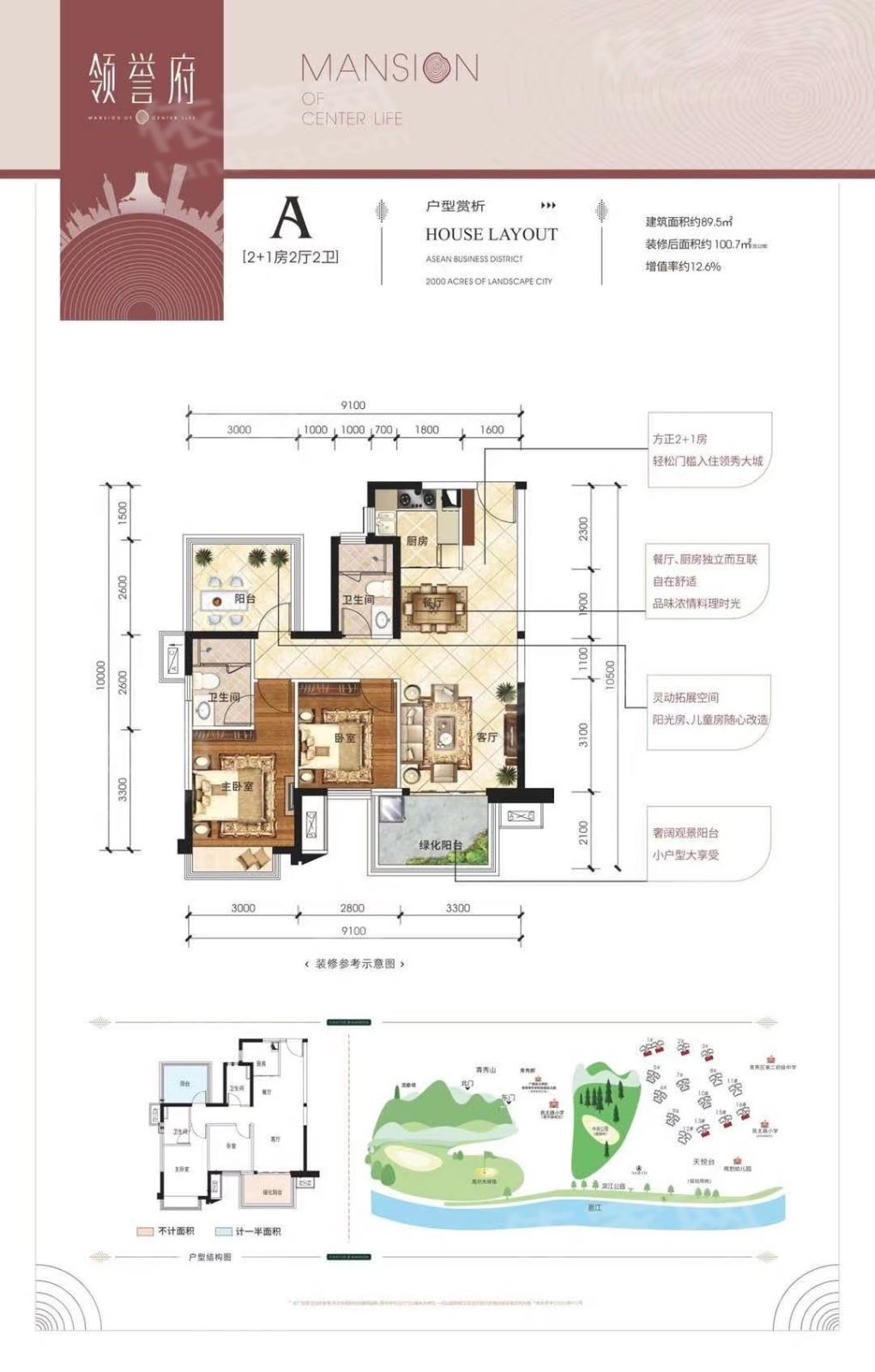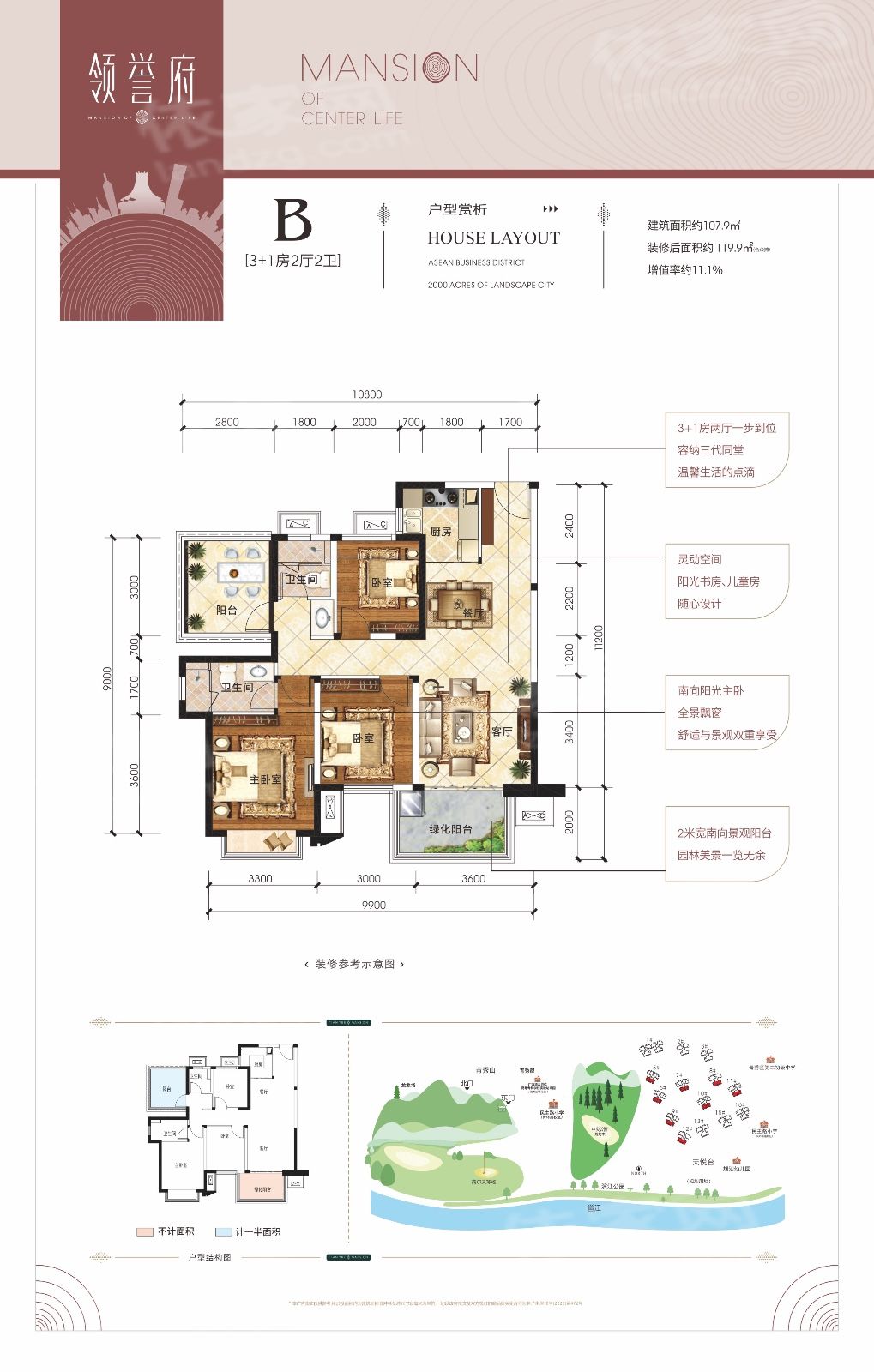 保利领秀前城项目从区域、资源、智能、艺术、生态、商务、商业七大块面,赋予居住者高品质的生活配套。一个住区,即是一座城市;引领新人居生活方式,以领秀九城的姿态,缔造前所未有的人居体验。保利领秀前城总占地约2000亩,规划有21万㎡商业、17万㎡生态商务、200亩公园等,开发完成后将成为一座拥有超过5万人的城中城。项目外拥6000亩青秀山、133公里江景,内揽200亩公园、9大主题园林盛景。青秀山公园、李宁体育公园、滨江公园等七大主题公园环抱围绕,更设计6公里健康步道、3公里滨江木栈道、垂钓 等休闲娱乐配套。项目采用多项人性化智能系统,将打造成为南宁未来十年智慧社区的样板小区。(1)中央公园就在家门口秀程府东面紧连着保利重金打造的200亩中央公园,将打造成为一个多功能城市级的生态公园,将人文、生态、运动、休闲商业融汇其中,成为城市新地标。(2)一城多校,在自家阳台看见孩子未来自配套多所幼儿园、2所小学、1所中学,在社区里面即能满足孩子0-15岁的教育需要,而【秀程府】西面紧挨着的就是民主路小学(青环路校区)、还有一所幼儿园(规划中),同时引入保利文化四馆,为居者提供浓厚文化浸染。(3)5A级青山保护区 江山湖公园环抱背靠万亩青秀山,面朝绝美邕江,周边更有李宁体育公园、滨江公园、方特东盟神话等五大主题公园环绕,集萃了南宁最精华的自然资源,是南宁最宜居的区域之一。(4)21㎡商业体量,繁华都心自成一城自身配套了21万㎡的丰富商业,涵盖了保利mall、保利广场、保利时光里、保利若比邻四大系列,足不出城,就可以满足您全部的生活所需(5)绝版户型王——88-128㎡三至四房秀程府的户型经过保利多次优化升级,面积段涵盖88㎡实用三房、100-128㎡舒适四房,拥有高赠送拓展空间、动静分区合理、大阳台设计、格局方正房间尺度舒适等特点。