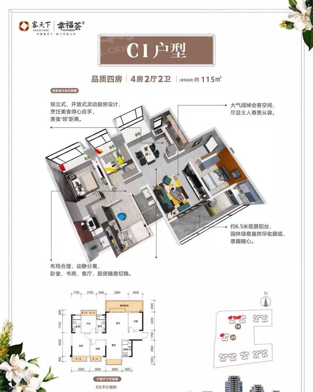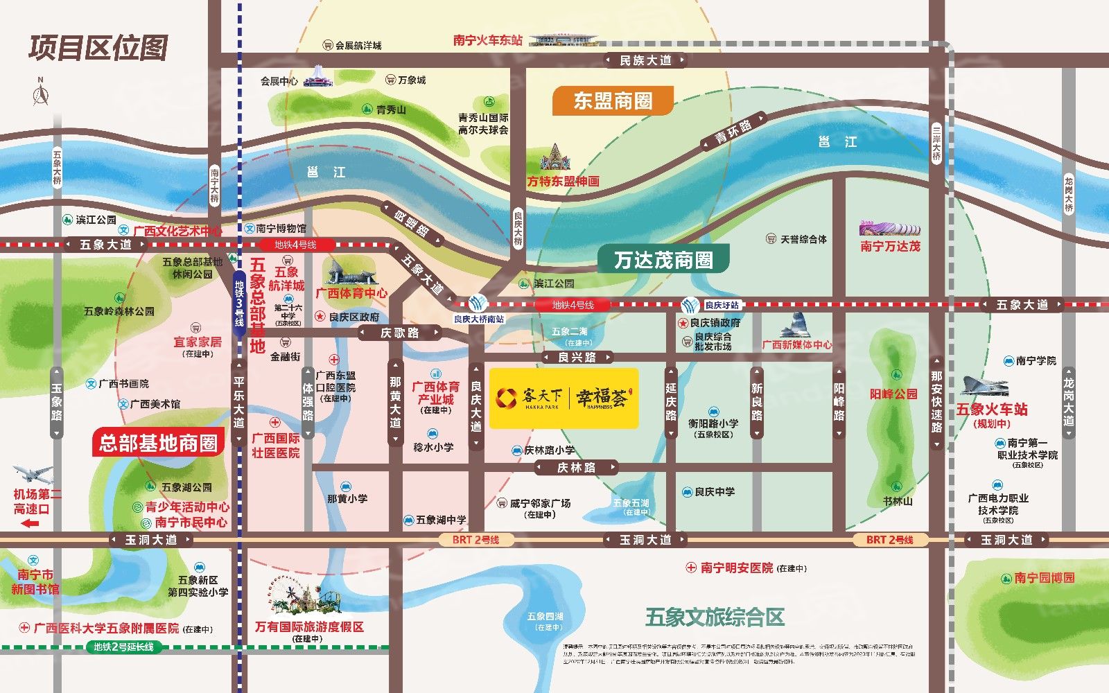 客天下幸福荟项目位于五象新区良庆桥南核心居住板块,良庆大桥桥头堡位置,人文气息浓厚,商圈配套完善,居住环境舒适。项目位于良庆大道主干道旁,毗邻地铁4号线良庆大桥南站(已开通),且目前区域主干“三纵两横”路网——五象大道、玉洞大道、平乐大道、那安快速路已基本建成,畅享立体交通系统带来的便捷,对内快速接驳城市各区,对外轻松通达周边城市。毗邻五象总部基地,附近有万达茂主题乐园、五象航洋城、恒大国际中心、宜家家居(在建)、三馆两街(三馆:广西美术馆、广西铜鼓博物馆、广西规划馆;三街:金融街、民族风情街、文化街)等。项目毗邻衡阳路小学、良庆中学、庆林路小学、五象湖中学等,医疗配套又广西国际壮医医院、广西医科大学五象附属医院(在建)、南宁明安医院(在建),享体育中心、市民中心、广西文化艺术中心、广西新媒体中心、五象湖公园、滨江公园等市政配套,各项配套资源优渥。